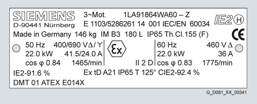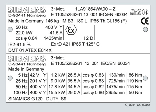 For fmax, see “Mechanical limit speeds nmax at maximum supply frequency fmax“. Example: Rating plate for mains-fed operation Ex tD, Zone 21 1LA9 186-4WA60-Z M34 Example: Rating plate for converter-fed operation Ex tD, Zone 21 Alternatively, rated operating points for SIMOVERT MASTERDRIVES, SINAMICS G110, SINAMICS G120, SINAMICS S120 or ET 200S FC on the rating plate can be ordered as follows: Y68 with plain text (C text): SIMOVERT MASTERDRIVES The converter type and the associated operating data are on the rating plate. The reasons for stamping the converter type on the motor rating plate are the different control levels for the converter with a converter output frequency of 45 Hz and above and the associated derating of the motor. For compliance with the admissible temperature class 130 (B), derating is necessary in the case of converter-fed operation in Zones 2, 21 and 22. The derating must be determined from the load data using the configuration tool SIZER for Siemens Drives (see the appendix). Factory certificates 2.1 for the named converters are stored under "Documentation" in the DT Configurator tool for low-voltage motors. Only "one" voltage must be assigned to voltage codes/order codes:
