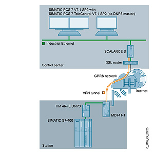 Станция подключается через GSM с поддержкой сервисов GPRS. При использовании на станции GPRS маршрутизатора MD741-1 и модуля SCALANCE S в центре управления появляется возможность установки  VPN соединений между центром управления и GPRS станциями.