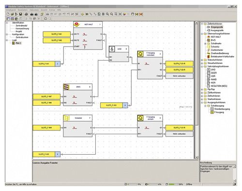 -- Не доступно Программное обеспечение для конфигурирования, тестирования и диагностики модульной системы безопасности 3RK3 - Modular Safety System ES (MSS ES)Все функциональные элементы могут перетаскиваться по экрану при помоли технологииdrag & drop. Все функции, безопасности и логически, доступны в блоках и могут легко комбинироваться друг с другом. Выходы могут независимо настраиваться на результат соответствующей ыункции безопасности. Кроме того, параметризация может производиться в MSS через шину PROFIBUS. Встроеные библиотечные макросы могут использоваться в ваших функциональных элементах. Пользовательский интерфейс программного обеспечения MSS ES |