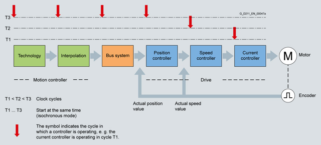 Большинство производственных устройств используют цифровые системы шин связи. Они отвечают за связь уровня контроля, контроля устройства и рабочих компонентов, т.е. датчиков и преобразователей. Существует два типа связи: связь процессов и передача данных. Связь процессовСвязь процессов включает в себя цикличную передачу данных контроля и датчиков. Объем передаваемых данных относительно невелик. Например, привод может осуществлять передачу объема между 4 и 32 байтами. Количество подключенных датчиков и преобразователей обычно указывается в конфигурации, что обеспечивает постоянность цикла передачи с использованием шины. Передача данныхПередача данных часто необходима для технических процессов и не связана напрямую с реализацией производственного процесса. Данные периодически (ациклично) передаются между подключенными устройствами. Объем этих передаваемых данных может быть очень большим и превышать 100 байтов для каждого устройства и задачи связи. Цикл шиныВ цикл шины входят связь процессов и передача данных. Цикл системы шин намного более короток, если не используется передача данных. Существует выражение: цикл шины "изменяется". Однако, эти изменения неприменимы к высокоточным приложениям в технологиях приводов. Типы связи системы шин Требования к регулированию приводаБольшинство современных приводов поддерживают цифровой контроль по обратной связи. Этот контроль по обратной связи гарантирует, что необходимые управляемые переменные привода, например, скорость или местоположение, достигаются и поддерживаются. Этот тип цифрового контроля по обратной связи состоит из нескольких взаимосвязанных элементов управления (местоположение, скорость, ток и т.д.). Они должны быть соотнесены с друг другом, т.е. синхронизированы. Эта синхронизация имеет большое значение для стабильной работы элементов управления и достижения и/или поддержания управляемых переменных значений. Если определенные компоненты контроля по обратной связи находятся вне привода, необходимо использовать систему шин для управления связью между этими компонентами. Эта система шин должна быть так же синхронизирована, как и контроль по обратной связи. Такой режим работы называется астатическим. Для приводов в области систем контроля движений астатический режим работы должен быть особенно быстрым и точным. Это гарантирует наличие только небольших отклонений в цикле шины. При этом такой режим работы называется не модуляцией цикла шины (большие отклонения), а флуктуацией (небольшие отклонения). Приемлемыми являются значения <1 µs. Это синхронизация реализуется с помощью тактовых сигналов. Постоянный цикл шины Чтобы систему шин можно было использовать для приложений контроля, она должна поддерживать режим связи и астатический режим. Для передачи данных часто используется дополнительная система шин. PROFIBUS и PROFINET могут удовлетворять всем этим требованиям в единой системе шин. Industrial Ethernet, предшественник PROFINET, не удовлетворяет требованиям, касающихся связи в режиме реального времени. Принцип управления цифровыми приводами