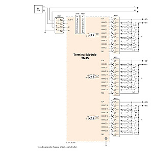 Терминальный модуль TM15 соединяется через DRIVE−CLiQ с управляющим модулем CU310 DP, CU320 или с NCU SINUMERIK solution line. Пример подключения терминального модуля TM15 |