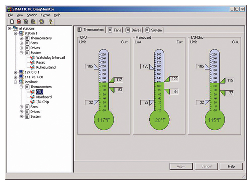 Программное обеспечение наблюдения и удаленной сигнализации SIMATIC PC DiagMonitor своевременно обнаруживает возможные ошибки в аппаратном или программном обеспечении. Он может использоваться для SIMATIC Box PC 627/840, Rack PC 840 и Panel PC 677/877 и м.б. заказан используя конфигуратор ПК или как отдельный продукт.
