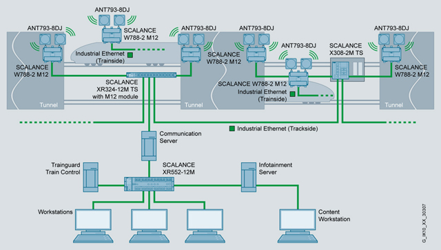 Приборы должны устанавливаться в местах, наиболее благоприятных для организации беспроводной связи. Корпус и интерфейсы обладают высокой стойкостью к механическим воздействиям. Все соединители оснащены резьбой или фиксаторами. Для получения оптимальных вариантов беспроводной связи поставляемые антенны могут быть заменены на антенны других типов. При необходимости точка доступа SCALANCE W788-2 M12 EEC может функционировать в режиме клиента. Прибор оснащен двумя беспроводными модулями и подобен двум отдельным устройствам беспроводной сети. Это позволяет создавать решения, в которых беспроводная связь поддерживается по двум различным направлениям. Например, вдоль железнодорожного пути и с поездами. Дополнительно, два беспроводных модуля могут использоваться для построения резервированной беспроводной сети. Обмен данными с поездами через SCALANCE W788-2 M Связь остается практически беспрерывной. Переключение с одной точки доступа на другую занимает несколько сот миллисекунд (IEEE 802.11). Для функционирования в режиме реального масштаба времени прибор SCALANCE W788 M12 EEC должен комплектоваться съемным носителем данных KEY-PLUG. |