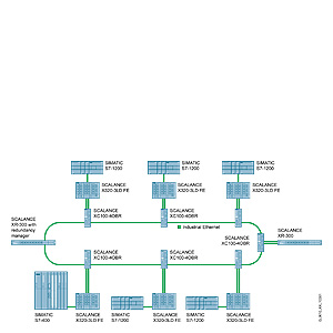 Резервированная сеть с оптическими шунтирующими реле SCALANCE XC100-4OBR Резервированная кольцевая сеть с поддержкой протокола MRP и оптическими шунтирующими реле SCALANCE XC100-4OBR |