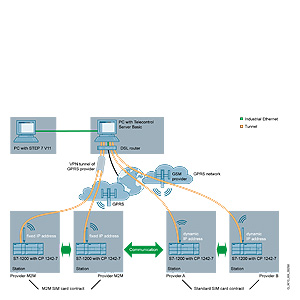 В сочетании с программным обеспечением "Telecontrol Server Basic" модуль CP 1242-7 позволяет создавать системы телеуправления, поддерживающие обмен данными через мобильные беспроводные сети. Внешние станции могут быть подключены к центру управления постоянно или временно. Центр управления способен поддерживать обмен данными со всеми удаленными станциями через OPC. Для дистанционного выполнения операций обслуживания сервисный компьютер с программным обеспечением STEP 7 может быть подключен к любой удаленной станции через центр управления. Подключение SIMATIC S7-1200 с CP 1242-7 к мобильной беспроводной сети GSM/GPRS. Режимы работы CP 1242-7 может использоваться в двух различных режимах: Telecontrol server (сервер телеуправления) В этом режиме управление обменом данными с центром управления и другими станциями телеуправления осуществляет центральный сервер телеуправления. Модуль CP 1242-7 подключается к серверу телеуправления. Программное обеспечение "Telecontrol Server Basic" передает данные в станцию управления или в другие станции телеуправления и выполняет мониторинг соединений. GPRS Direct (непосредственный GPRS обмен данными) В этом режиме CP 1242-7 выполняет непосредственный обмен данными с центром управления и другими станциями телеуправления. По сравнению с режимом "Telecontrol server" этот режим не требует наличия сервера телеуправления и дополнительного программного обеспечения. Этот режим может использоваться в случаях, когда существует гарантированная возможность установки соединения с партнером по связи по его уникальному адресу. Для обеспечения этого требования должен использоваться специальный сервис оператора сети, часто называемый "машина-машина" (M2M). Конфигурирование Вся необходимая для использования модуля CP 1242-7 информация (данные провайдера, права доступа, режимы работы) конфигурируется в STEP 7 Basic от V11 и выше. Эти данные могут быть реконфигурированы во время работы. Для этой цели можно использовать библиотеку специальных функций. Буферизация данных Нарушение обмена данными через мобильную беспроводную сеть сопровождается буферизацией данных. После восстановления связи выполняется передача сохраненных в буфере сообщений с их отметками даты и времени. Синхронизация времени В зависимости от используемого режима работы модуль CP 1242-7 позволяет выбирать соответствующий механизм синхронизации даты и времени. В режиме "telecontrol server" центр управления передает сигналы синхронизации во все удаленные станции. Если программное обеспечение "Telecontrol Server Basic" не используется, то синхронизация выполняется через NTP сервер. Программа центрального процессора может использовать данные синхронизации для установки внутренней даты и времени удаленной станции. Библиотека функций Библиотека функций для CP 1242-7 обеспечивает поддержку:
