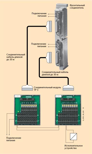 Ленточные соединительные кабели используются для подключения фронтальных соединителей SIMATICTOPConnect к терминальным блокам. Для этой цели используется ленточный кабель 1х16 жил (обычный или экранированный) или 2х16 жил (обычный) с одним или двумя плоскими соединителями на каждом конце. Ленточный кабель помещен в защитную оболочку, повышающую стойкость кабеля к внешним воздействиям. Конструкция плоского соединителя позволяет регулировать длину соединительного кабеля. Для подключения жил ленточного кабеля к контактам плоского соединителя используется метод прокалывания изоляции. Максимальная длина соединительного кабеля может достигать 30м.