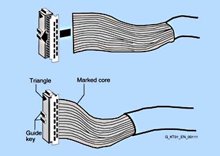 Плоский ленточный кабель следует продевать таким образом, чтобы помеченная жила этого кабеля заканчивалась над маркировочным треугольником штекера. Штекер выполнен с использованием технологии монтажа с прорезанием изоляции и может быть легко запрессован.