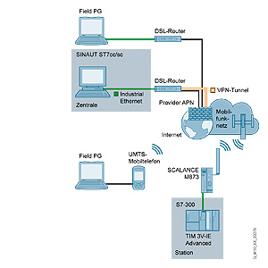 Пример применения: дистанционное обслуживание с использованием VPN туннеляКлассический пример дистанционного программирования, настройки параметров и диагностики через VPN туннель, дополненный функциями дистанционного мониторинга производственных машин и установок, размещенных в различных точках земного шара из единого сервисного центра, подключенного к интернету. Обеспечивает получение защищенного доступа к любым IP приборам, в том числе и к IP контроллерам, подключенным через локальную сеть к модулю SCALANCE M873.