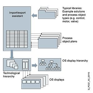 ? Массовое редактирование данных с использованием Import-Export AssistantImport/ Export Assistant (IEA) содержит эффективный инструментарий для выполнения операций массового редактирования данных. Целью такого редактирования является многократное использование типов переменных процесса и готовых решений в различных проектах PCS7. Применение IEA наиболее эффективно на больших предприятиях или в рамках нескольких предприятий с большим количеством переменных процесса одного типа. Применение пакета позволяет значительно сократить время конфигурирования новых систем. Заранее сконфигурированные данные (списки переменных процесса или схемы CAD/CAE) могут быть импортированы в систему проектирования и использоваться для автоматического генерирования переменных процесса. Полученные таким образом данные могут подвергаться дальнейшему конфигурированию и использоваться с новым набором параметров. Для ускорения разработки новых решений данные проекта PCS7 могут редактироваться не только в среде IEA, но и экспортироваться в другие приложения (например, в MS Excel или MS Access) и редактироваться в их среде. Отредактированные данные можно вновь импортировать в проект.
