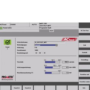 ? Система адаптивного управления для оптимизации автоматического загрузчика – интегрированное программное решение для SINUMERIK 840D controlНа основании значений измерений на инструменте ACfeed рассчитывает наиболее оптимальную скорость загрузки для большинства условий резания, а также автоматически увеличивает или уменьшает скорость загрузки (например, 70% или 140%). Загрузка шпинделя всегда установлена в оптимальное положение на отметке 100%. Это не только экономит время и существенно увеличивает число обрабатываемых деталей до очередной заточки, но также защищает инструменты от перегрузки. Прежде всего, система ACfeed используется для фрезерования, но также зарекомендовала себя как инструмент, подходящий для других видов обработки, как управление резанием в процессе токарной обработки. ACfeed также может использоваться в качестве интегрированной системы мониторинга. Система оптимальна для автоматического производства. Благодаря оптимизации загрузки решение существенно экономит время и делает процесс более стабильным. Общее время цикла сокращается в среднем на 5%. Система оптимальна для производства самолетов. Благодаря тому, что инструменты не перегружаются, а также возможности индивидуальной настройки мощностей (даже без увеличения скорости загрузки) повышается надежность обработки без потери точности. Система интеллектуального управления скоростью загрузки обеспечивает: