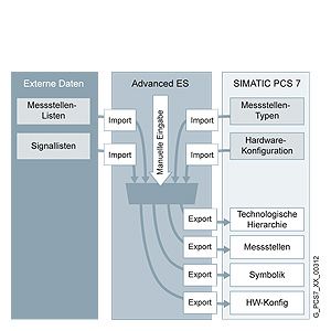 В дополнение к широким возможностям импорта данных, AdvES поддерживает массовую обработку данных и таким образом уменьшает объем рутинных работ в проектном инжиниринге. При работе с AdvES, существенно, чтобы вся информация об аппаратных средствах присутствовала в SIMATIC PCS 7 проекте. Существующие данные из системы управления SIMATIC PCS 7 и списка процессных тегов и сигналов ввода/вывода в формате листа Microsoft Excel могут импортироваться в в AdvES и обрабатываться для дальнейшего использования в SIMATIC PCS 7 инженерной системе. AdvES предлагает интегрированную функцию множественного импорта измененных данных из Microsoft Excel. После начальных определений , AdvES распознает процессные теги из Excel листов, автоматически назначает им типы тегов процесса из PCS 7 проектной библиотеки, и генерирует следующие данные:
