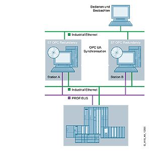 ? S7 OPC Redundancy позволяет создавать резервированные OPC UA серверы, обеспечивая доступ к предприятию со стороны систем оперативного управления и мониторинга. S7 OPC Redundancy гарантирует выполнение синхронизации данных между двумя SIMATIC NET S7 OPC серверами. Все операции выполняются "прозрачно" для OPC клиентов. В случае неисправности все задачи по обслуживанию OPC клиентов принимает на себя резервный OPC сервер. Обмен данными между OPC клиентами и OPC серверами выполняется с использованием стандартных функций связи OPC UA. Для обмена данными с программируемыми контроллерами SIMATIC S7 используются S7 функции связи. Такой обмен данными поддерживается программными продуктами SIMATIC NET SOFTNET или HARDNET-S7 для Industrial Ethernet, которые формируют базовую платформу для функционирования SIMATIC NET IE S7 OPC Redundancy. Пакет S7 OPC Redundancy обеспечивает поддержку:
