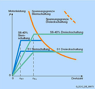 Типичная диаграмма отношения мощности к скорости для двигателей 1PM4 с масляным охлаждением с переключением звезда/треугольник 1)
