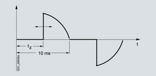 Обычные диммеры работают по принципу отсечки фазы по переднему фронту. В начале каждой полуволны синусоиды диммер, не являясь токопроводящим элементом, блокирует прохождение тока к лампе. Только по истечении определенного времени задержки tz, которое пользователь может установить по собственному усмотрению, в диммере срабатывает электронный выключатель TRIAC и подает ток ко всем подключенным потребителям. Таким образом, обеспечивается возможность плавной регулировки яркости подключенных источников света. Возникающее во время включений и отключений напряжение помех гасится с помощью соответствующих фильтров.