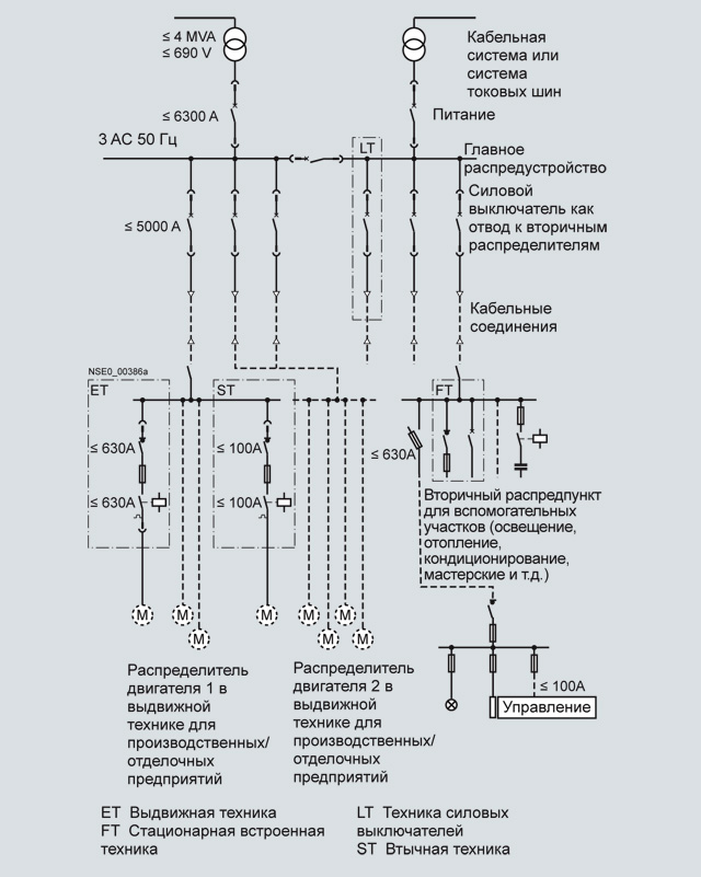 Распределение энергии в низковольтной сети в основном осуществляется через главный щит (силовой центр) и множество вторичных или двигательных распределителей, называемых также центрами управления двигателями (МСС). См. пример рядом.