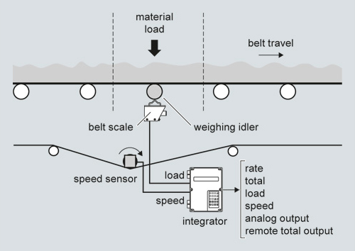 Ленточные весы Siemens Milltronics измеряют только вертикальную составляющую силы веса. Материал передвигается вниз по конвеерной ленте и, проходя через конвеерные весы, оказывает силу, пропорциональную нагрузке материала, которая оказывается на роликовые опоры. Результирующее усилие, приложенное к каждой весоизмерительной ячейки, передается на тензорезисторы. Когда на тензорезисторы подается напряжение питания от электронного интегратора, приложенное усилие преобразуется в электрический сигнал, который передается интегратору. Отклонение весоизмерительных ячеек в вертикальном перемещении ограничиваются упором, встроенного в ленточные весы или весоизмерительную ячейку. Упоры защищают весоизмерительные ячейки от повреждения при высоких перегрузках.
