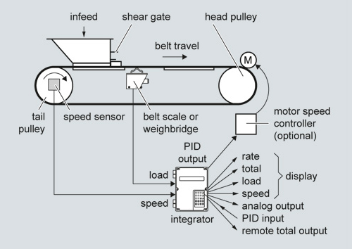 Ленточный весовой дозатор обеспечивает точное измерение массового расхода материала. В большинстве приложений уровень материала на ленте устанавливается регулируемой, механической заслонкой в зависимости от размера частиц материала. В этом случае регулирование расхода материала через дозатор осуществляется с помощью регулирования скорости ленты. Но в некоторых случаях скорость ленты остается постоянной и управление расходом материала при необходимости берет на себя подающее устройство. Весовой дозатор состоит из трех компонентов: датчиков взвешивания, датчика скорости и интегратора.Также в комплект входит механическая система подачи материала. Во время работы дозатора нагрузка и скорость ленты постоянно измеряются и на основании этих данных вычисляется значение расхода материала. Измеренное значение расхода сравнивается с заданным значением и в случае рассгласования значений встроенный ПИД- регулятор осуществляет необходимую коррекцию скорости ленты.