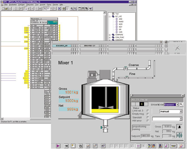 В то время как весоизмерительные модули интегрируются в систему автоматизации SIMATIC S7 преимущественно с помощью типичных SPS-языков программирования AWL (операторный список), KOP (контактный план) или FUP (функциональный план), проектирование в системе управления производственным процессом SIMATIC PCS 7 осуществляется через графическое переключение на CFC-плане (CFC = Continuous Function Chart). То есть пользователь занимается не программированием, а созданием структуры.