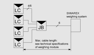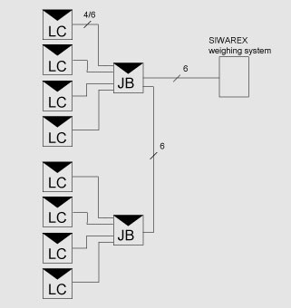 Внутреннее сопротивление, показатель и номинальная нагрузка всех включенных параллельно весоизмерительных ячеек должны быть одинаковыми. Распределительная коробка не накладывает ограничений на величину этих значений. Весоизмерительные ячейки можно подключать по четырех- или шестипроводной технологии.