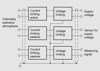 Защитные барьеры ограничивают ток и напряжения в линиях питания, кабелях датчиков и линиях передачи сигналов измерительных ячеек, установленных на взрывоопасном участке.