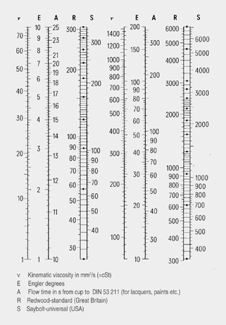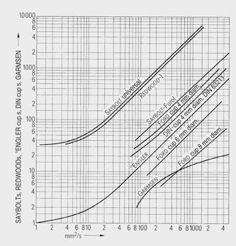 The figure "Conversion into common engineering units" shows these common units in comparison to the mm /s values of the kinematic viscosity of the CGS system.
