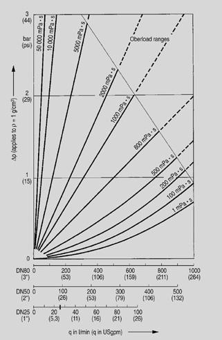 - The pressure loss, i.e. the pressure difference occurring in the mechanism through hydraulic losses. A maximum value of 3 bar (43.5 psi) is permissible. This value is only reached with very high viscosities and large flow rates. The meter size and the viscosity of the liquid are decisive factors for the actual pressure loss which occurs.