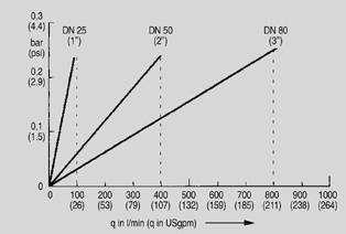 Pressure loss p for liquid gas with 0.25 mPa·s (cp), approx. 16 °C (60.8 °F) and PN 16 (MWP 232 psi); values for liquid gas authorized by the German calibration authorities: 100, 400 and 800 I/min (26.4, 106 and 211 USgpm))
