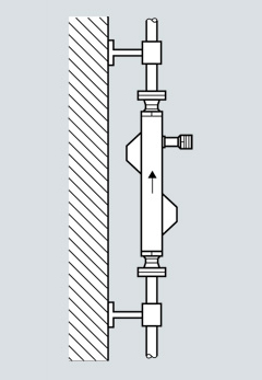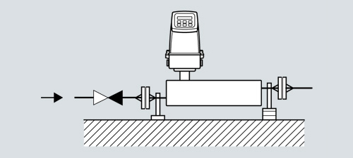 Наилучшей является вертикальная позиция установки с направлением потока снизу вверх (см. рисунок). Преимуществом этого является то, что при скорости расхода ноль содержащиеся в жидкости твердые примеси осаждаются вниз, а пузырьки газа из измерительной трубки поднимаются вверх. Кроме этого возможно простое опорожнение измерительной трубы. Это предотвращает отложения.