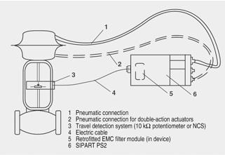 Для обеспечения ЭМ-помехоустойчивости согласно EN 61326/A1 и NAMUR NE21 при использовании внешних датчиков перемещения, необходимо установить в позиционер (блок регулятора) специальный ЭМ-фильтровальный модуль (см. заказные параметры: ЭМ-фильтровальный модуль).