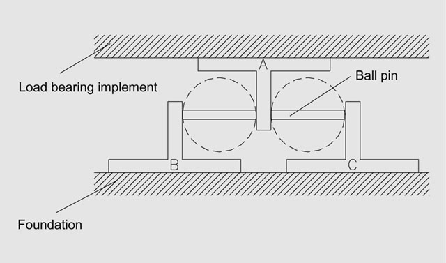 Опора А несущей конструкции опирается на фундамент через два болта с шаровой головкой и контропоры В и С. За счет этого А зафиксирована в направлении контропоры, а в вертикальном направлении, наоборот, возможен свободный откат.
