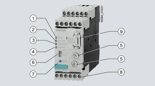 Модульное электронное реле перегрузки с внешним источником питания 3RB22 (с моностабильными вспомогательными контактами) и 3RB23 (с бистабильными вспомогательными контактами ) до 630 A (до 820 A с использованием дополнительных трансформаторов) были разработаны для защиты асинхронных двигателей с обратнозависимой от тока задержкой срабатывания, с нормальными и тяжелыми условиями пуска (см. Функции) с целью предотвращения чрезмерных тепловых перенапряжений из-за перегрузок, несимметрии нагрузки по фазам или обрыва линейного провода. Перегрузка, несимметричная нагрузка по фазам, или обрыв линейного провода приводят к увеличению тока, потребляемого двигателем, выше установленного номинального тока двигателя. Этот ток измеряется измерительным модулем тока и оценивается специальным электронным модулем оценки, которые подключены друг к другу. Оценивающий электронный модуль управляет вспомогательными контактами. Вспомогательные контакты отключают нагрузку посредством контактора. Время отключения зависит от отношения тока нагрузки и тока уставки Ie и сохраняется в виде не зависящей от времени работы реле стабильной характеристики расцепления (см. Характеристики расцепления). О состоянии расцепления сигнализирует постоянно горящий красный светодиод "Overload" (Перегрузка).