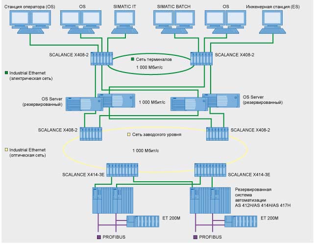 - SCALANCE X414 3E с двумя Gigabit-Ethernet портами для процессной и OS LAN терминальной шинами с резервированной оптической гигабитной кольцевой технологией; обеспечивает максимальную пропускную способность, особенно для больших заводов с большим количеством узлов и сегментов сети