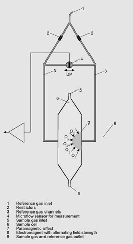 In the case of OXYMAT 61, one gas (1) is a reference gas (N2, O2 or air), the other is the sample gas (5). The reference gas is introduced into the sample chamber (6) through two channels (3). One of these reference gas streams meets the sample gas within the area of a magnetic field (7). Because the two channels are connected, the pressure, which is proportional to the oxygen content, causes a cross flow. This flow is converted into an electric signal by a microflow sensor (4).