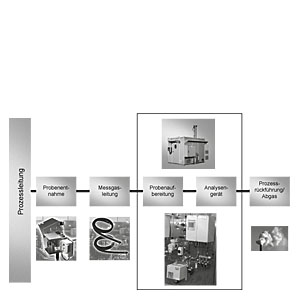 При экстрактивных процедурах измерения, анализируемая проба извлекается из технологической линии и, предварительно подготовленная, подается на анализатор через линию пробы и систему пробоподготовки. Эта система, например, регулирует давление, температуру и поток пробы, и при необходимости освобождает газ пробы от пыли и влаги. Это гарантирует выполнение измерений при определенных условиях. Более того, анализатор защищается от повреждающих воздействий.