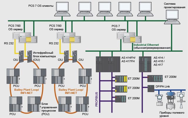 При миграции с Bailey INFI 90/NET 90 на SIMATIC PCS 7 V6.0, существующие "Bailey consoles" замещаются станциями оперативного управления (Одноместные станции или клиент/серверные системы) на основе SIMATIC PCS 7 V6.0. OS одноместные станции OS сервера в таких системах могут быть резервированными или обычными. The Bailey Plant Loop/INFI-NET соединяется в каждом случае к PCS 7/90 операторской станции (Одноместная станция/Сервер) через компьютерный интерфейс с помощью RS 232 или SCSI.