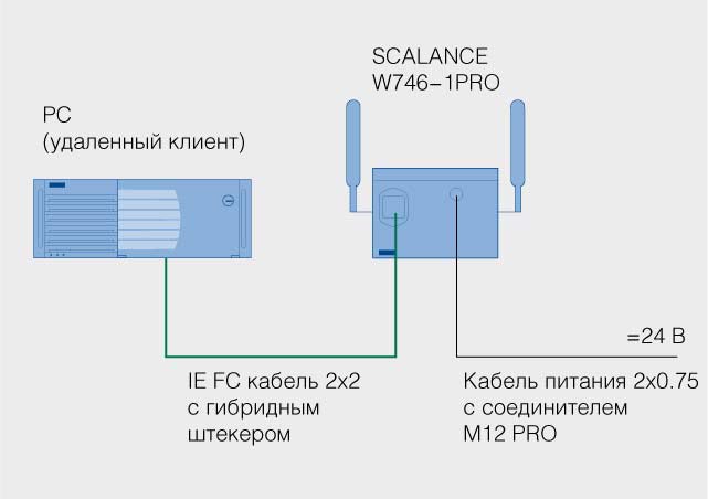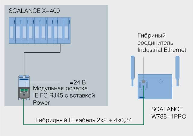 Подсоединение источников данных и питания к SCALANCE W746 1PRO Ethernet клиентскому модулю и SCALANCE W788 1PRO точки достуа осуществляется гибридным или раздельными кабелями (предпочтительно на коротком расстоянии):