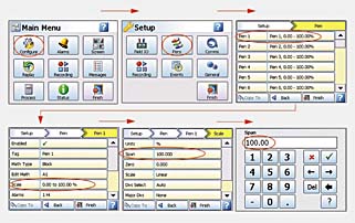 Пример пути по меню самописца от Главного меню до конфигурации Шкалы пера, с быстрой и понятной навигацией