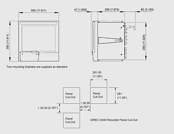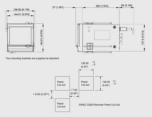 SIREC D300, размеры в мм (дюймах) и вырез в панели