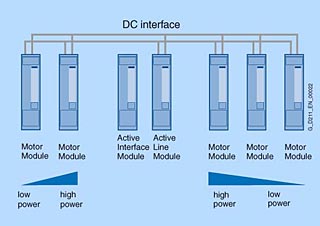 • В случае несбалансированного распределения мощности, например, если высокомощные Модули Двигателя используются вместе с маломощными Модулями Двигателя, между Модулями Двигателя, которые больше всего отличаются по номинальной мощности, должен быть установлен Модуль Торможения, так как площади сечений шин сети DC будут отличаться в размерах из-за пропускной способности встроенных шин сети DC
