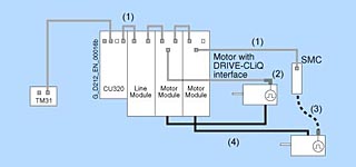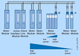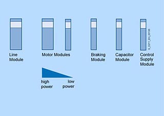 Многоосевой привод SINAMICS S 120 состоит из Модуля Линии, Модулей Двигателя, компонентов цепи DC, Блока Управления и вспомогательных модулей расширения.