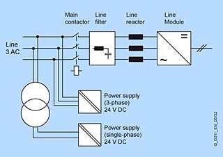• В случае больших потребностей в токе, в одной группе приводов должны присутствовать несколько источников питания 24 В DC. Другие потребности в питании обеспечиваются 24-вольтными терминальными адаптерами (только в формате книги).