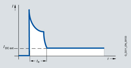 Ёмкостные конденсаторы большинства компонентов должны быть заполнены, когда подача питания 24 В DC включается в первый раз. Для зарядки этих конденсаторов от источника питания сначала должен поступить пиковый ток, который может составлять основу требований по току IDC ext, рассчитанных выше. Этот пиковый ток должен учитываться при выборе защитных элементов, например, миниатюрных автоматических выключателей для подключения к источнику питания 24 В DC (типы с пропускными значениями I2 t в соответствии с характеристикой D). Пиковый ток наблюдается в течение промежутка времени te, меньшем, чем 100 мс. Предельное значение определяется по импедансу источника 24 В DC и его максимальному току, ограниченному электроникой