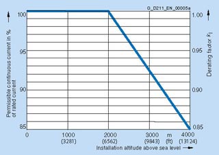 Выбранный блок может работать с напряжением до 480 В 3 переменного тока 0,88 или 720 В DC 0,88 = 422 В 3 переменного тока или 634 В DC, т.е. при данных условиях 400-вольтный асинхронный двигатель (индукционный двигатель) может работать без ограничений. Несмотря на это, из-за высоты установки может потребоваться снижение номинальных значений асинхронного двигателя (индукционного двигателя).