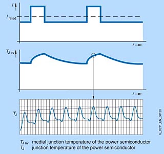 При заданном токе теплоотдача увеличивается пропорционально частоте следования импульсов. Чтобы не превысить максимальную теплоотдачу и температуру теплопоглощающего устройства для более высоких частот следования импульсов, номиныльный выходной ток Irated должен быть понижен. Когда для частоты следования импульсов применяется поправочный коэффициент kf, значение номинального выходного тока Iratedf приводится в соответствие выбранной частоте следования импульсов.