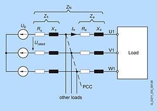 Снижение напряжения между системой электропитания и нагрузкой, обусловленное импедансом, наблюдается до тех пор, пока в цепи течёт ток. В симметричной трёхфазной системе электропитания это импеданс цепи Zn, который рассчитывается из импеданса Zs системы электропитания и импеданса Ze нагрузки.