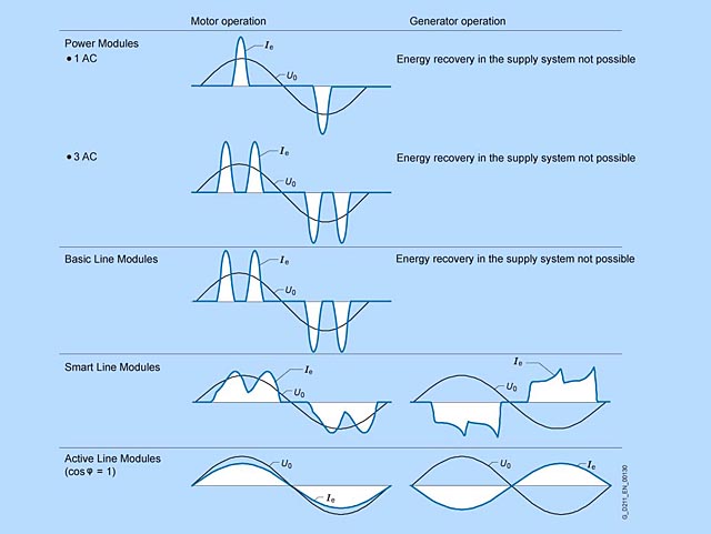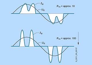 Базовые Модули Линии и Силовые модули включают выпрямительный мост со стороны цепи. Основными составляющими, участвующими в процессе выпрямления с нагрузочным ёмкостным сопротивлением для сглаживания напряжения в цепи DC, являются гармоники тока в цепи, которые вызывают синусоидальную подачу тока. Диаграмма отображает форму колебаний сигнала базового тока Силового Модуля или Базового Модуля Линии как функцию отношения Rsc мощности короткого замыкания.