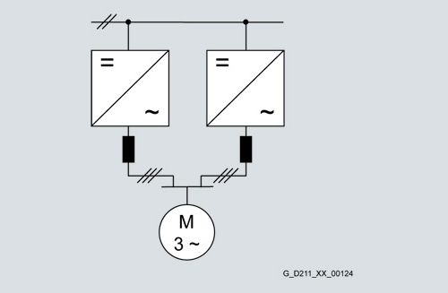 Последний вариант более предпочтителен для приводов с большой выходной мощностью, т.к. в данном случае распределительные коробки двигателей будут ограничивать ток. Двигатели с раздельными системами обмотки допускают все типы модуляции (т.е. пространственно-векторную модуляцию и контурную модуляцию). Если параллельно-подключённые Модули Двигателя обладают единой системой обмотки, контурная модуляция использоваться не может, а максимально возможное линейное выходное напряжение Ua ограничено 0,67 x напряжение цепи DC.