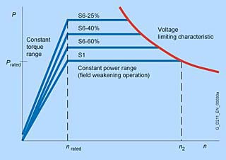 Для частот выше номинальной frated  двигатели работают в диапазоне ослабления поля . Доступный момент понижается пропорционально примерно. frated/f,, и мощность остаётся без изменения. Примерный запас в 30% должен быть принят для случая остановки особенно для режимов с V/f характеристикой, Этот интервал ослабляется пропорционально  (frated/f)2.