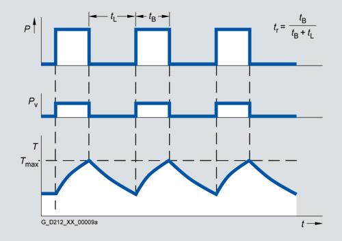 Рабочие циклы с постоянным периодом состояния "включено" ставят специальные требования к рабочим характеристикам, как, например, функция скорости, например, M = константа, M ~ n2, M ~ n или P  = константа.