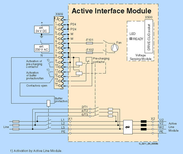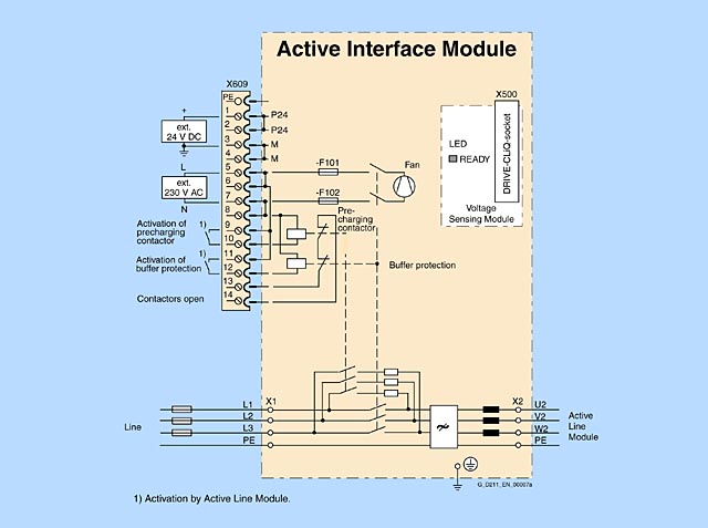 Стандартное подключение активного модуля интерфейса с внешне установленным контактором перепуска (типы HI и JI)